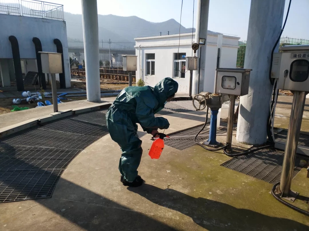 湖南浏阳水务公司组织人员对出入人员进行测温消毒,对办公、生产和公共区域喷洒消毒液进行消毒
