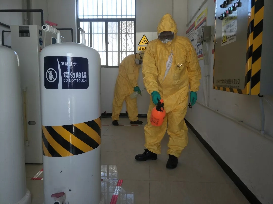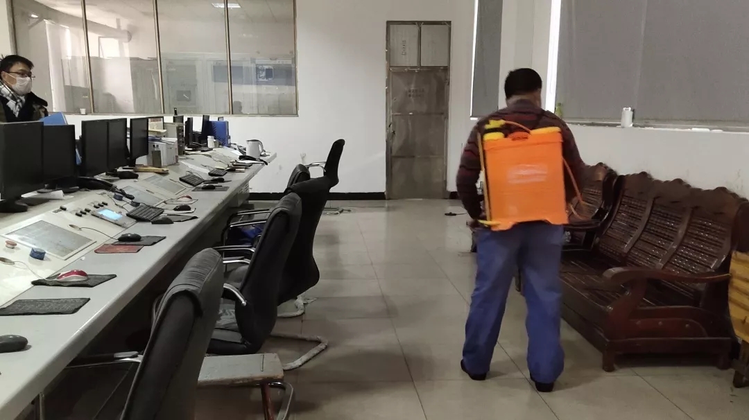 湖南浏阳宏宇热电公司组织人员对办公、生产区域喷洒消毒液进行消毒