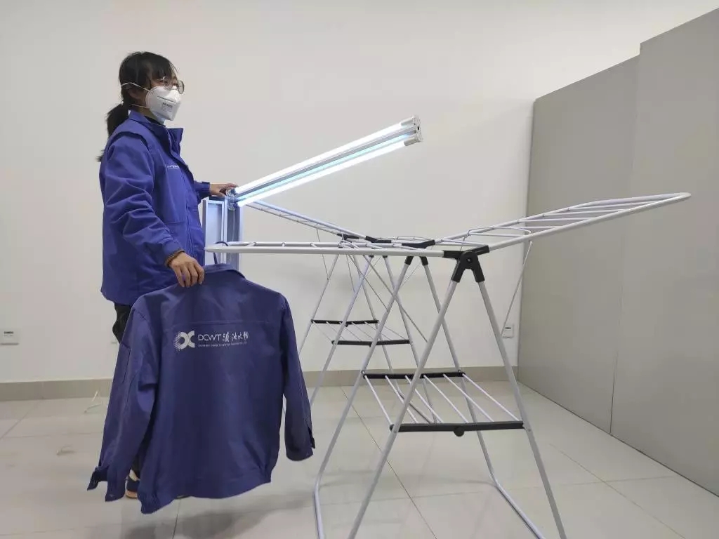 昆明市第十三水质净化厂职工利用紫外杀菌灯对工作服消毒