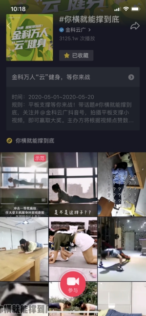金科万人“云”健身抖音平台挑战赛现已高能开赛!5月1日话题正式上线,至今话题总参赛视频总量达6000个,总体播放量达4000w+!更有单条视频播放量达115w+,获赞6000+ !活动人气指数直线飘红,热力爆表!