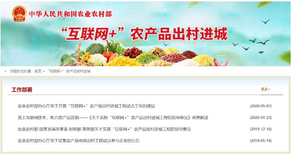 2019年12月26日,农业农村部、国家发展改革委、财政部及商务部联合出台了《关于实施“互联网+”农产品出村进城工程的指导意见》,从工程实施层面提出了系统解决农产品“卖难”问题的具体方案。
