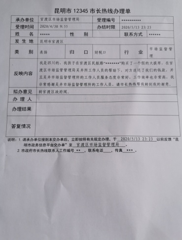 近日,官渡区市场监督管理局吴井市场监督管理所收到一份昆明市12345市长热线办理单,投诉人张先生反映内容为:我是四川的,我孩子在官渡区民航路购买了一个假的大提琴,在官渡区市场监督管理局吴井所工作人员的帮助下,对方退还了我们的钱款,并且吴井市场监督管理所的工作人员服务态度非常好,工作效率也非常高,我非常感谢吴井市场监督管理所的工作人员,请市长热线帮我转到我的谢意。