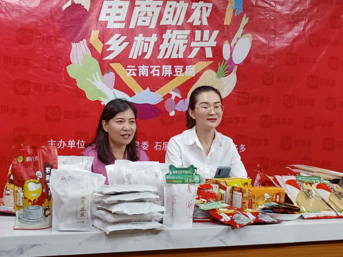 石屏县县长张秋红(左)上播带货,区域品牌石屏豆腐拥抱全国大市场。(摄影:杨成华)
