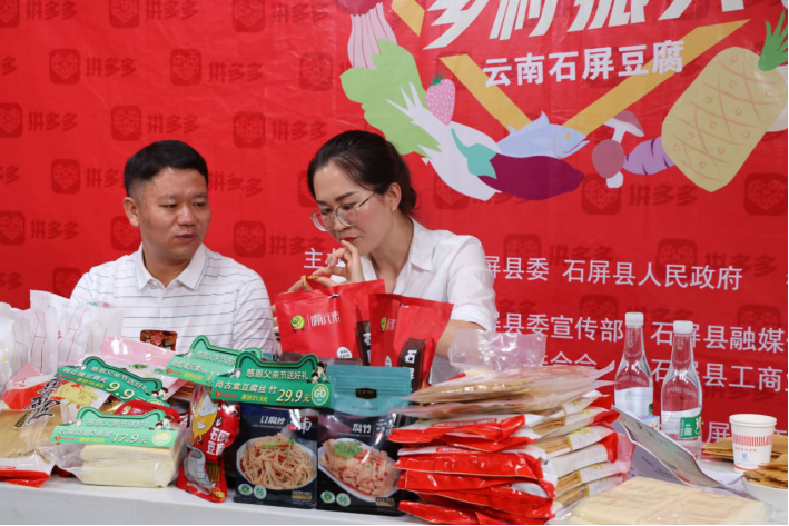 “石屏豆腐在全省各地都有线下店。在云南的烧烤摊,没有我们的豆腐都不叫烧烤摊。今年4月份,在沪滇合作背景下,在上海挂职的胡副县长努力帮我们把石屏豆腐形象旗舰店开到了上海徐汇区的菜场里,非常受欢迎,评价也很好。”普亮明告诉记者,虽然线下销售十分火爆,但是一直以来,石屏豆腐在线上的销售都不理想,很多外地网友甚至都没听说过石屏的豆腐产品,这一次拼多多开展的直播活动,不仅促进了豆腐的销量,更是在互联网端为石屏的特色品牌作了很大的提升。