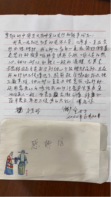 昆明信息港讯 “阳光服务、创造价值”作为中国光大银行昆明金江支行阳光服务的理念,一直凝结着全行员工矢志不渝的初心和使命。近日,90岁高龄的金女士来到支行营业大厅,为金江支行送来一封感谢信,以此感谢全体工作人员提供的热忱和贴心帮助。