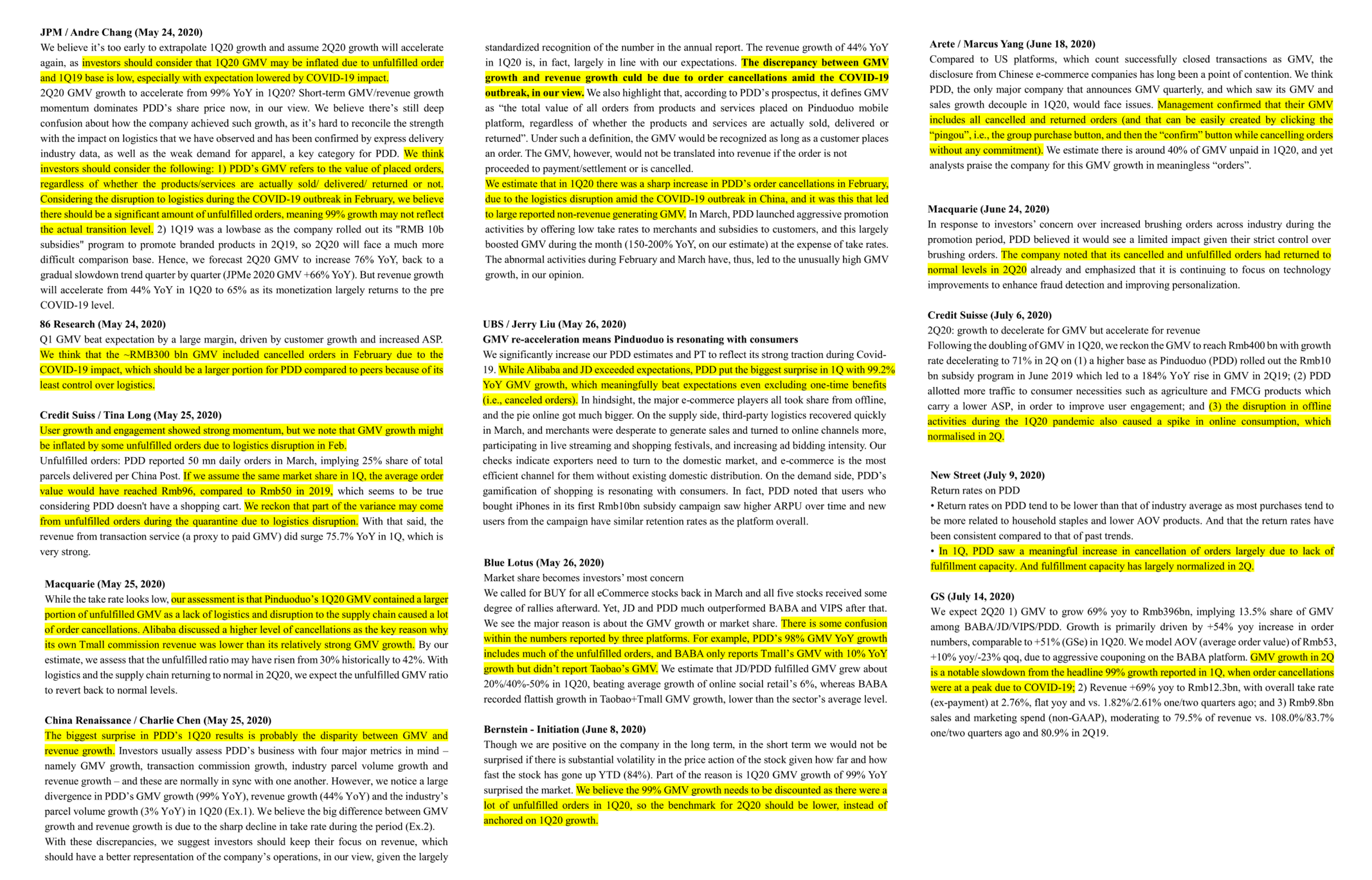 研究机构New Street报告中原文是,PDD saw a greater than normal levels of cancellation of orders or undelivered products due to lack of fulfillment capacity. Hence, part of the reported GMV in 1Q has some one-off distortion that is not part of the normal course of business. 意思是,一季度受疫情影响,因缺乏履约能力而取消订单或未交货的情况高于正常水平。因此,一季度报告中的GMV数据有一些一次性的失真。