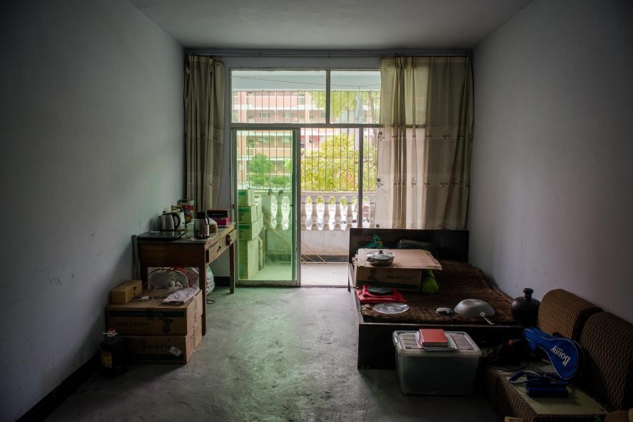 肖鸣在沙坝乡的“家”是一间非常简陋的宿舍。宿舍里没有厨房,锅碗瓢盆都是他从自己家里带来的,饿了就在木桌搭成的简易灶台上用电磁炉煮饭。