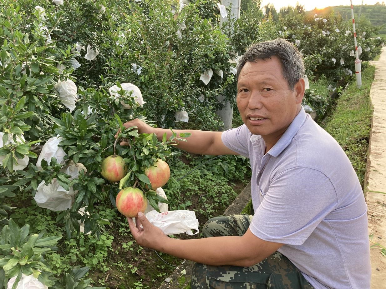 ▲新农人起绍平在石榴林边查看即将采摘上市的石榴,这片多多农园中的石榴树都已挂上了沉甸甸的果实。李宇 摄