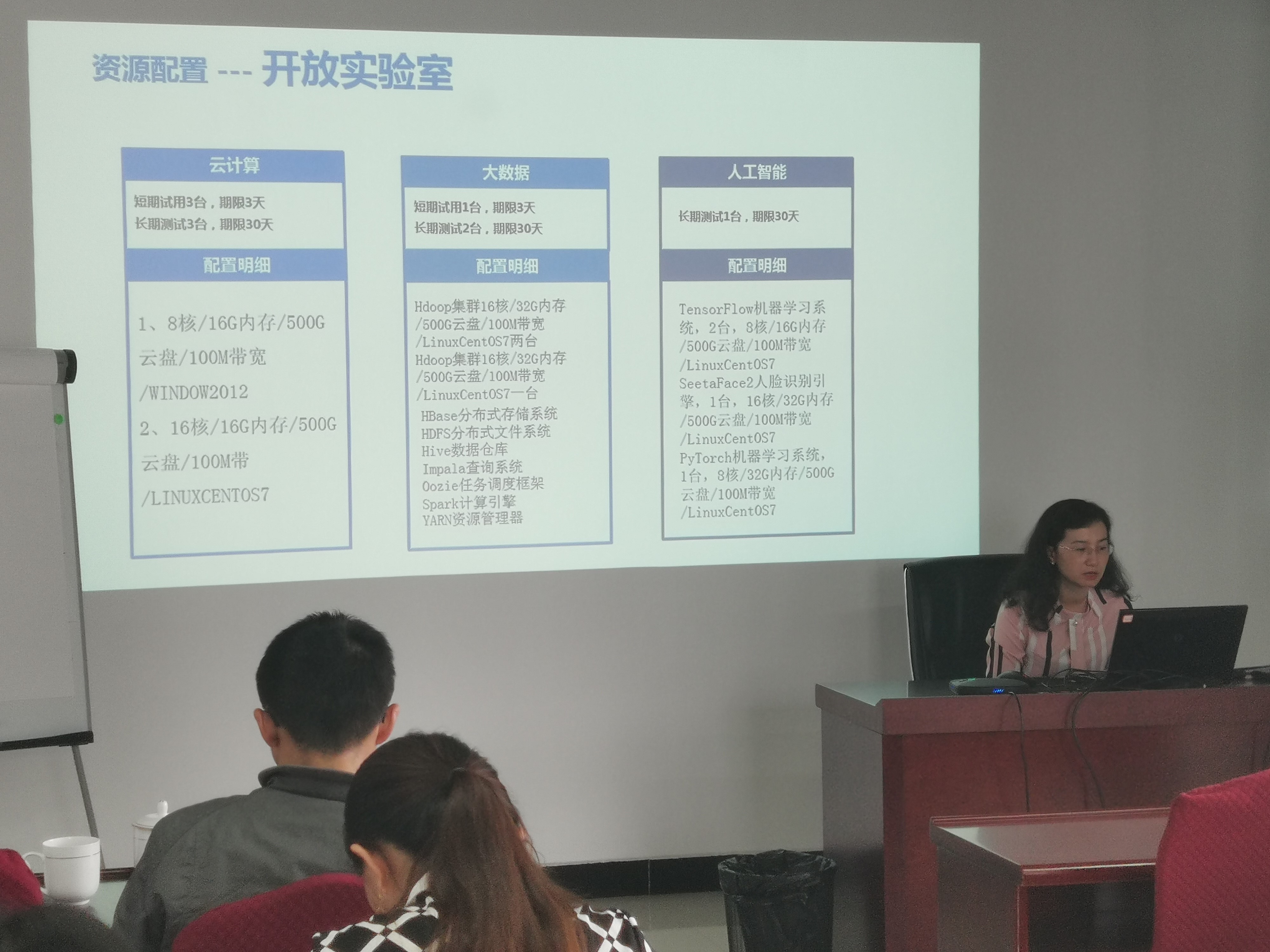 宣讲会由云南天成科技有限公司两位相关负责人分内容讲解,第一部分从公司简介、行业合作、资源配置、使用推介等进行介绍,表示项目以提升昆明高新区新一代信息技术产业技术研发、信息共享、服务管理等能力为目标,整合阿里云现有云上开发组件资源,结合新一代超融合云计算基础架构及云南软件园现有资源体系,为不同研发方向的企业提供免费的云计算、大数据、人工智能新一代信息技术公共实验平台环境;第二部分,为参加活动的企业详细演示平台操作流程,讲解平台使用指南。企业对平台申请使用时间、使用到期后续问题进行提问,相关负责人给出解答。