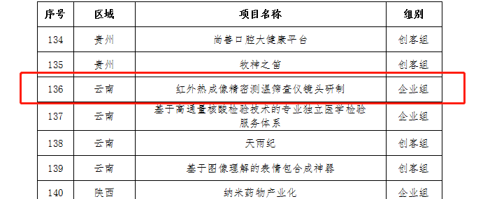 根据国家工信部发布的《关于2020年“创客中国”中小企业创新创业大赛200强名单的公示》,云南省有4个项目上榜,其中《红外热成像精密测温筛查仪镜头研制》项目来自“2020昆明高新杯”创新创业大赛获奖企业-昆明全波红外有限公司。此前发布的2020年“创客中国”生物医药中小企业创新创业大赛获奖名单中,获得企业组优胜奖的《芒果苷衍生物抗痛风新药开发》项目亦来自“2020昆明高新杯”创新创业大赛获奖企业-云南苏理生物医药科技有限公司。