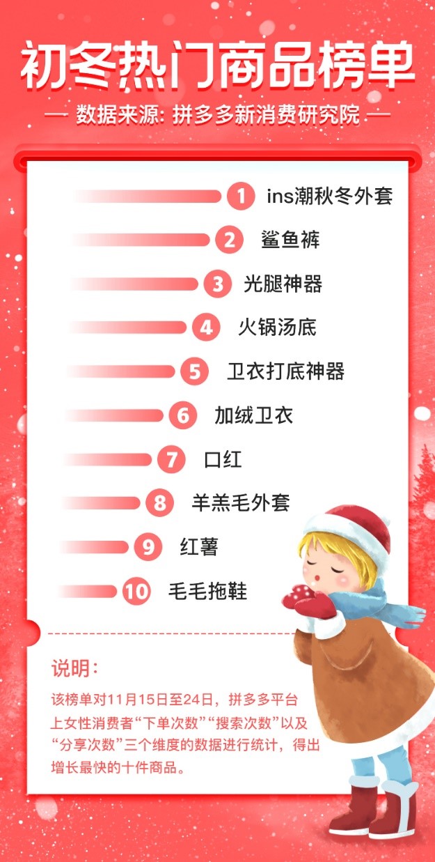 11月25日,新电商平台拼多多发布《初冬女性消费热门商品榜单》。该榜单对11月下旬以来,平台女性消费者的购物行为进行统计分析,综合了消费者搜索、分享及下单指数综合排名后得出。