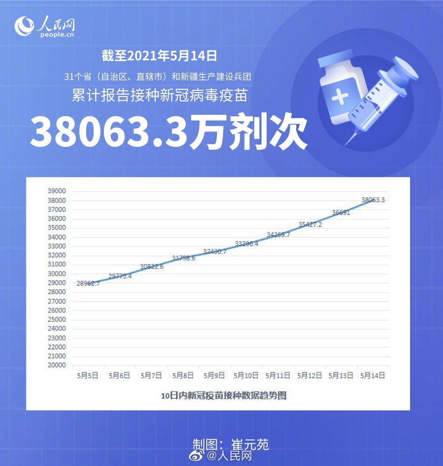 据国家卫生健康委官网消息,截至2021年5月14日,31个省(区、市)及新疆生产建设兵团累计报告接种新冠病毒疫苗38063.3万剂次。14日单日接种1372.3万剂次,突破了13日的单日最高接种量。