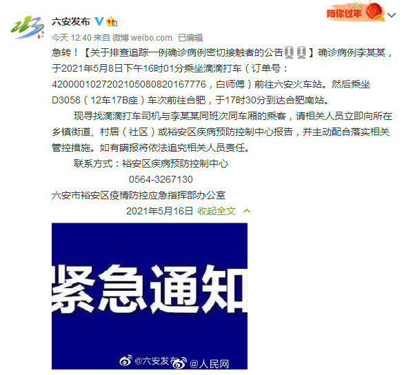 据@六安发布 消息:确诊病例李某某,于2021年5月8日下午16时01分乘坐滴滴打车(订单号:4200001027202105080820167776,白师傅)前往六安火车站。然后乘坐D3058(12车17B座)车次前往合肥,于17时30分到达合肥南站。现寻找滴滴打车司机与李某某同班次同车厢的乘客,请相关人员立即向所在乡镇街道、村居(社区)或裕安区疾病预防控制中心报告,并主动配合落实相关管控措施。如有瞒报将依法追究相关人员责任。