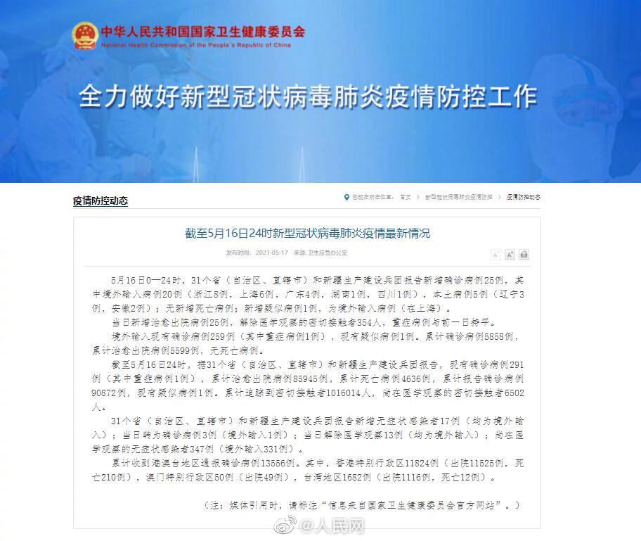 5月16日0—24时,31个省(自治区、直辖市)和新疆生产建设兵团报告新增确诊病例25例,其中境外输入病例20例(浙江8例,上海6例,广东4例,湖南1例,四川1例),本土病例5例(辽宁3例,安徽2例);无新增死亡病例;新增疑似病例1例,为境外输入病例(在上海)。#新冠肺炎最新动态#
