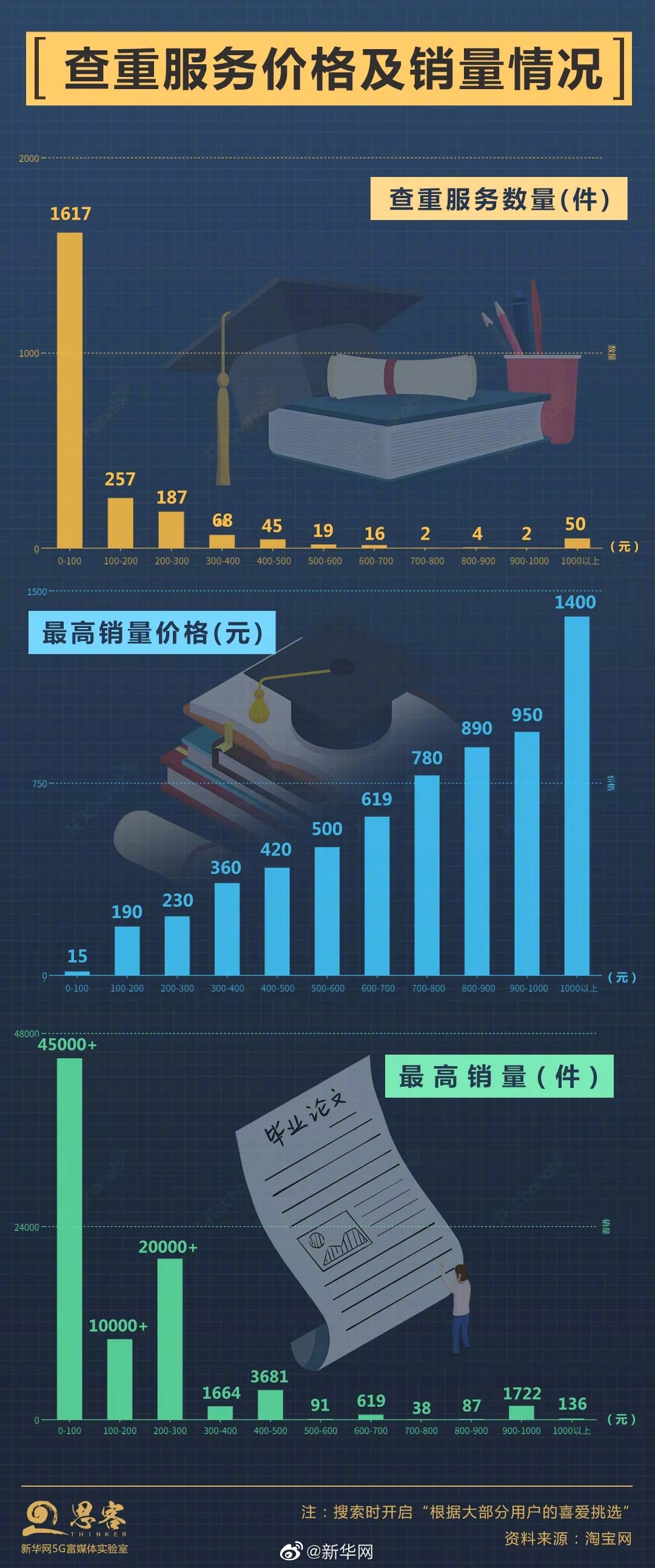 中国知网本科论文查重价格是388元一篇,硕博定稿检测价格为528元一篇。但由于知网学术不端检测系统仅面向机构提供服务,不对个人开放,学生只能通过其他渠道购买查重服务。在淘宝搜索“毕业论文查重”,“根据大部分用户的喜爱”会出现2000多个产品。其中,价格较高的查重服务标价超过2500元。但从购买评论看,这些查重服务的评价参差不齐,“满意”“准确率很高”以及“和学校查重差距太大”“明显重复的地方没检测出来”等评价均时有出现。