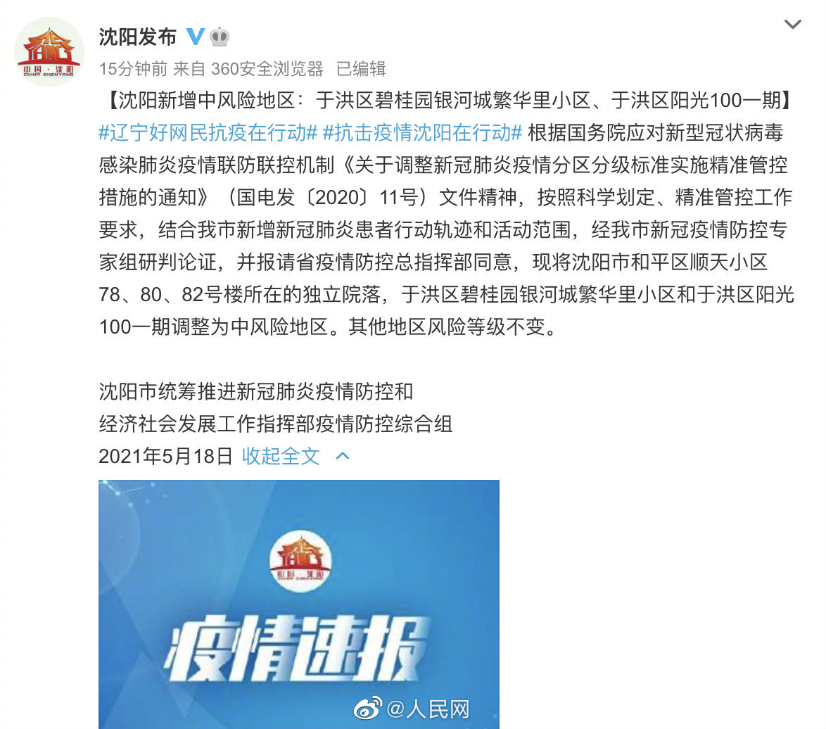 据@沈阳发布 ,经沈阳市新冠疫情防控专家组研判论证,并报请省疫情防控总指挥部同意,现将沈阳市和平区顺天小区78、80、82号楼所在的独立院落,于洪区碧桂园银河城繁华里小区和于洪区阳光100一期调整为中风险地区。其他地区风险等级不变。