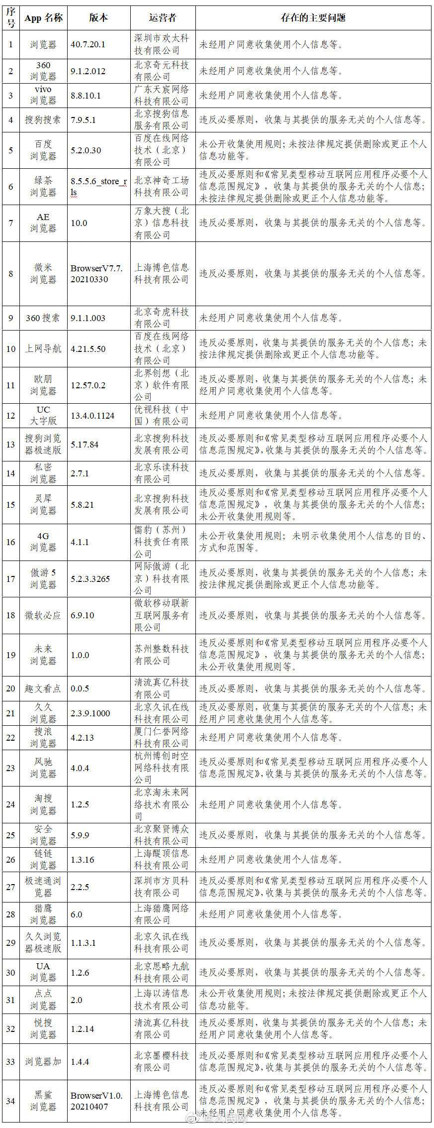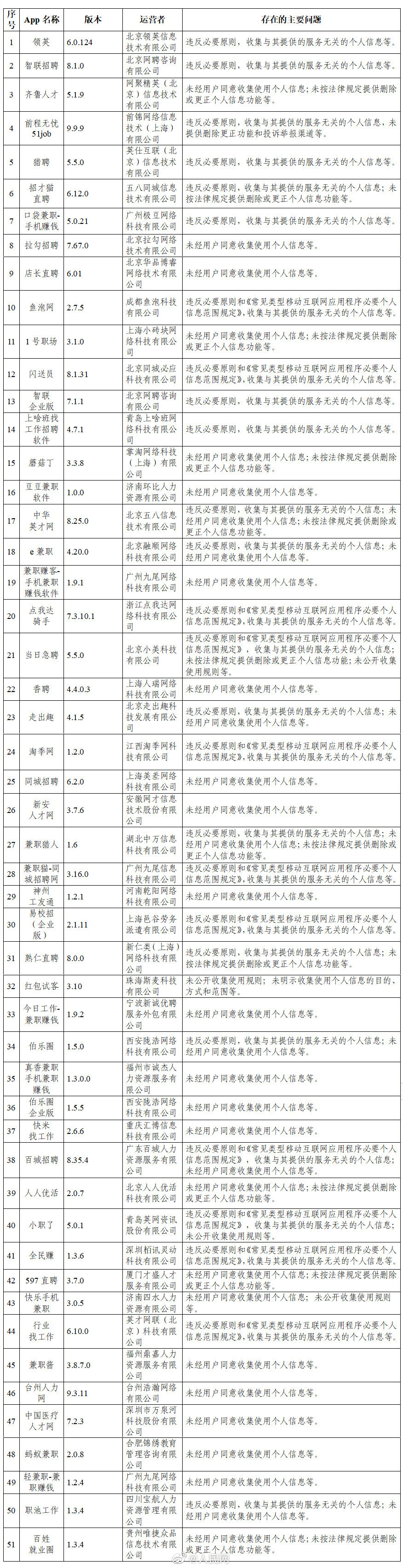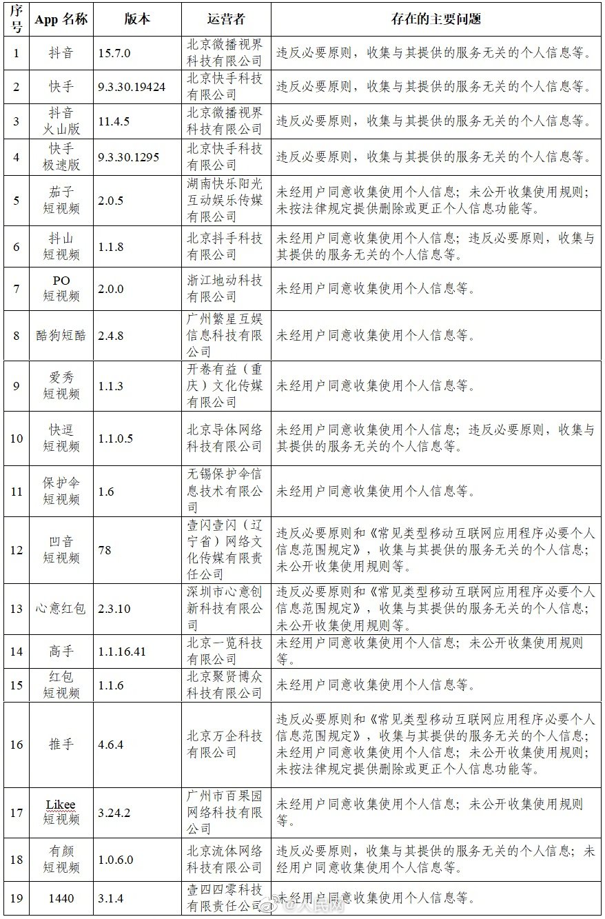 近期,针对人民群众反映强烈的App非法获取、超范围收集、过度索权等侵害个人信息的现象,国家互联网信息办公室依据《中华人民共和国网络安全法》《App违法违规收集使用个人信息行为认定方法》《常见类型移动互联网应用程序必要个人信息范围规定》等法律和有关规定,组织对短视频、浏览器、求职招聘等常见类型公众大量使用的部分App的个人信息收集使用情况进行了检测。戳图↓↓