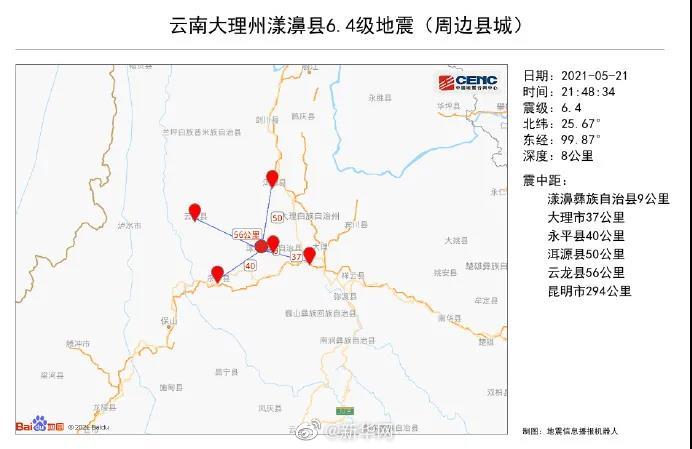 中国地震台网正式测定:5月21日21时48分,在云南大理州漾濞县(北纬25.67度,东经99.87度)发生6.4级地震,震源深度8公里。据移动人口大数据分析,震中20公里范围内人口数约6.2万,50公里范围内约216万,100公里范围内约539万。震中5公里范围内平均海拔约2268米。据了解,云南大理州漾濞县连发多次地震,云南多地州震感强烈。目前,多地消防力量紧急集结。(来源:央视新闻)