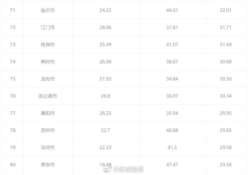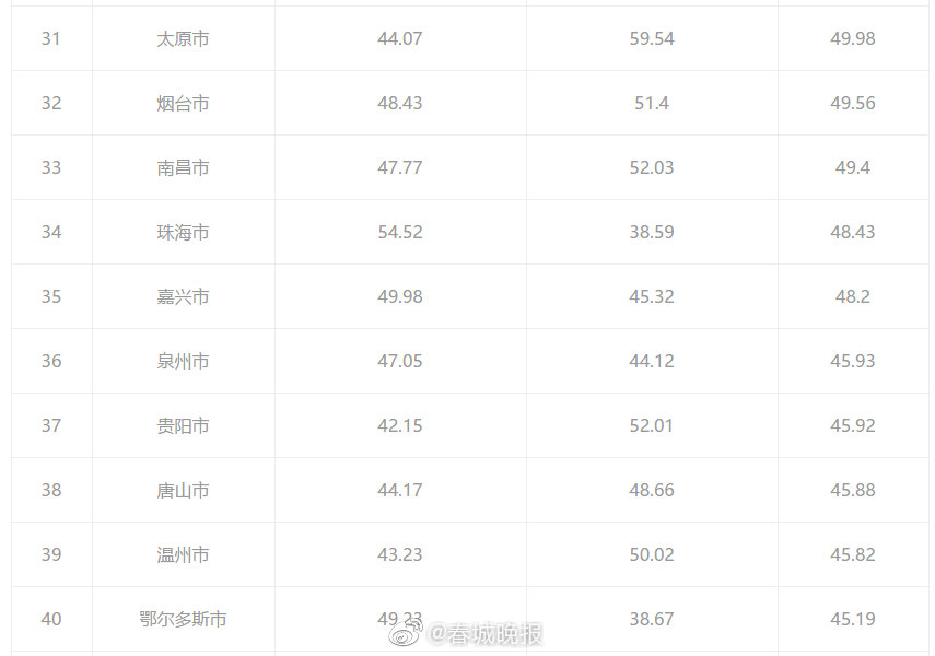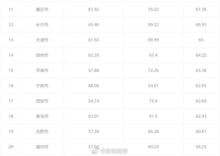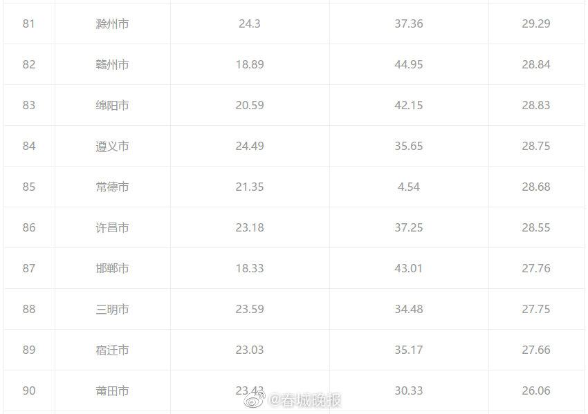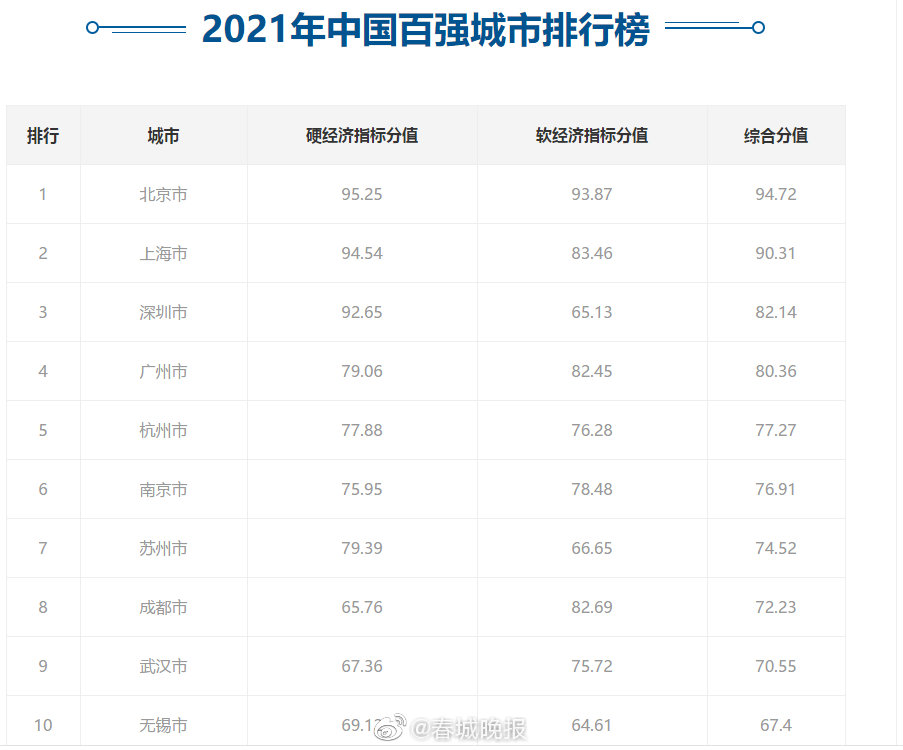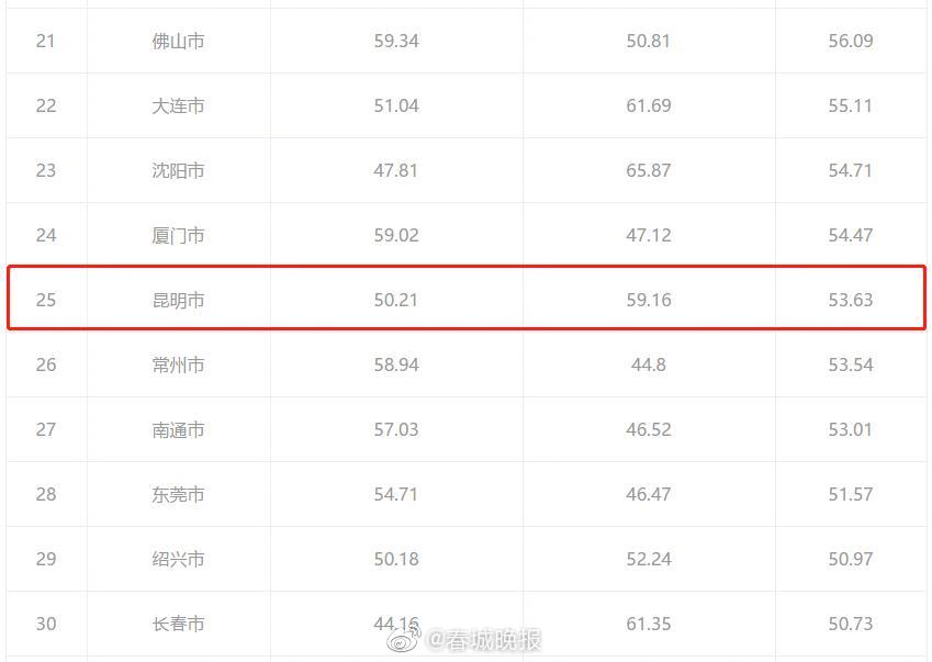 “2021年中国百强城市排行榜”近日公布,昆明排第25位,比去年上升了两位。在“2021年中国百强城市排行榜”上,北京、上海高居前两位,综合分值分别为94.72和90.31。位居第三至第十位的依次是深圳(82.14)、广州(80.36)、杭州(77.27)、南京(76.91)、苏州(74.52)、成都(72.23)、武汉(70.55)和无锡(67.40)。