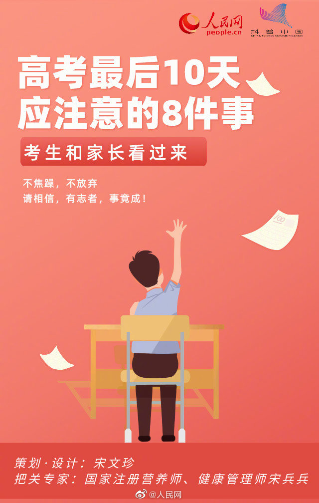 ①中午后忌喝茶和咖啡;②家长不要过分激励;③听一些音乐帮助入眠;④饮食不搞特殊化,吃清淡,不贪辣;⑤吃饭不要吃得太饱……#高考倒计时10天#,这份2021高考赶考指南拍了拍你,转给身边的高考生!加油!@科普中国高考倒计时10天,这8件事要注意!
