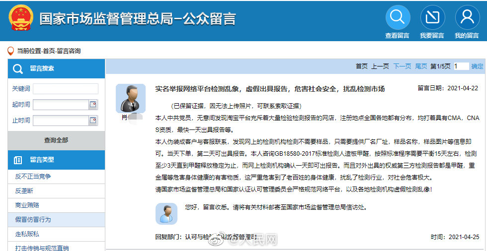 无需寄送样品,电商平台一键下单,一份“检验检测报告”次日就横空出世。报告上带有CMA、CNAS字样,声称甲醛含量“未检出”。而扫报告上的二维码后,微弹出的却是一个“质检信息”公众号,账户主体是个人…网上能随便买到检验检测报告?保真吗?戳→财经观察:无需送样也能测 部分网购平台质检报告随便买(人民网)