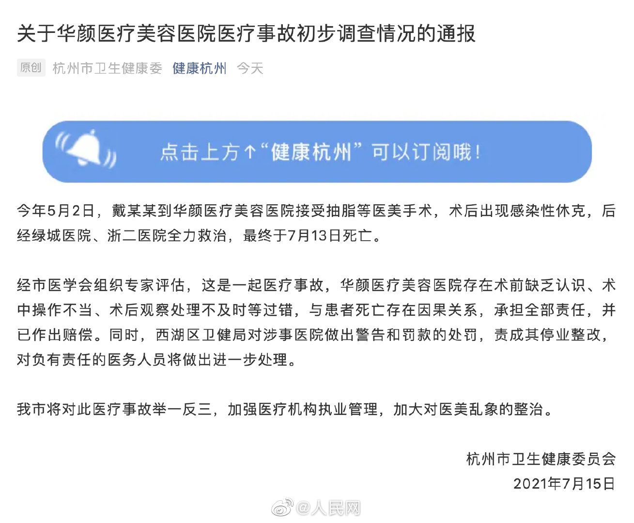 杭州卫健委通报女子抽脂感染致死事件,女子抽脂感染致死为医疗事故