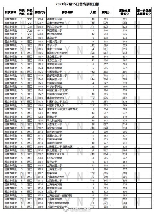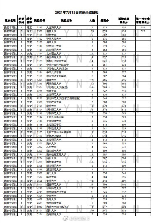 7月16日上午,云南省招生考试院发布最新一期录取日报,包含提前本科批及国家专项批。其中,清华大学和北京大学在国家专项批次总共录取29人。