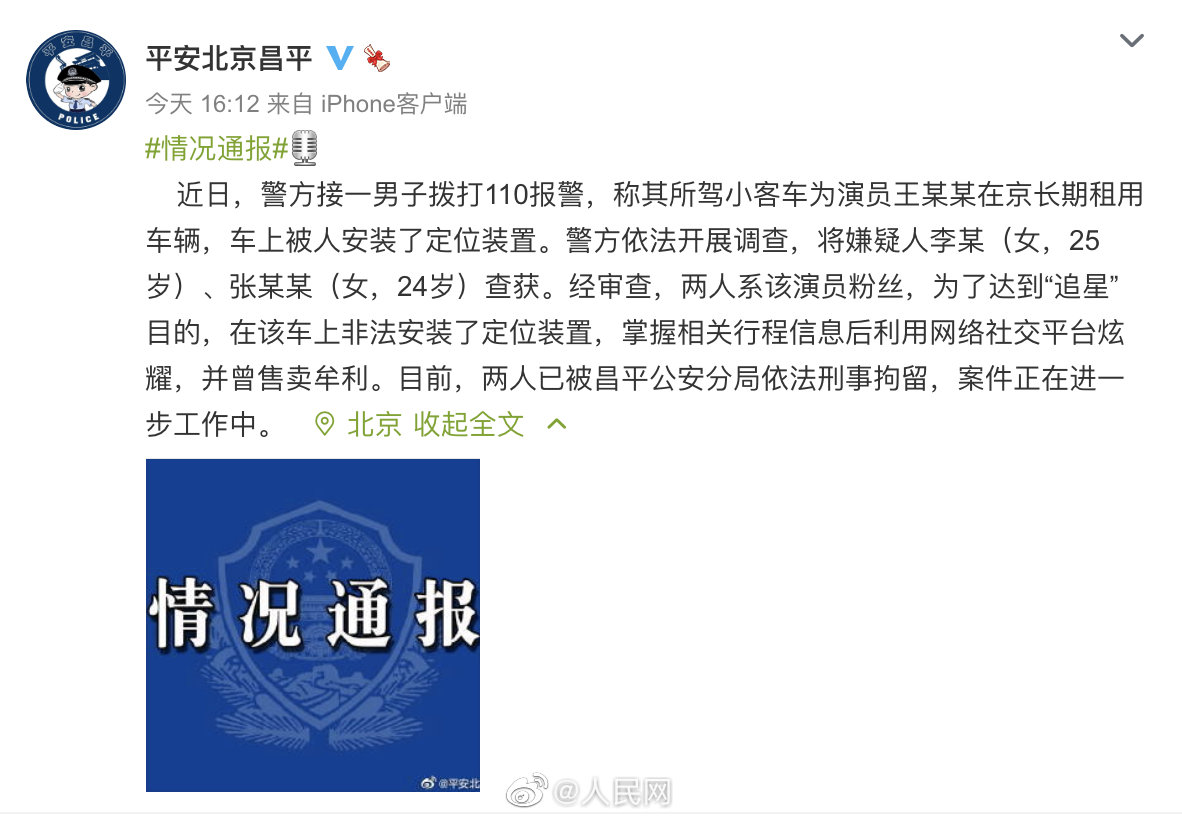 据@平安北京昌平 :近日,警方接一男子拨打110报警,称其所驾小客车为演员王某某在京长期租用车辆,车上被人安装了定位装置。警方依法开展调查,将嫌疑人李某(女,25岁)、张某某(女,24岁)查获。经审查,两人系该演员粉丝,为了达到“追星”目的,在该车上非法安装了定位装置,掌握相关行程信息后利用网络社交平台炫耀,并曾售卖牟利。目前,两人已被昌平公安分局依法刑事拘留,案件正在进一步工作中。