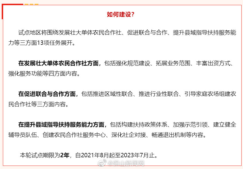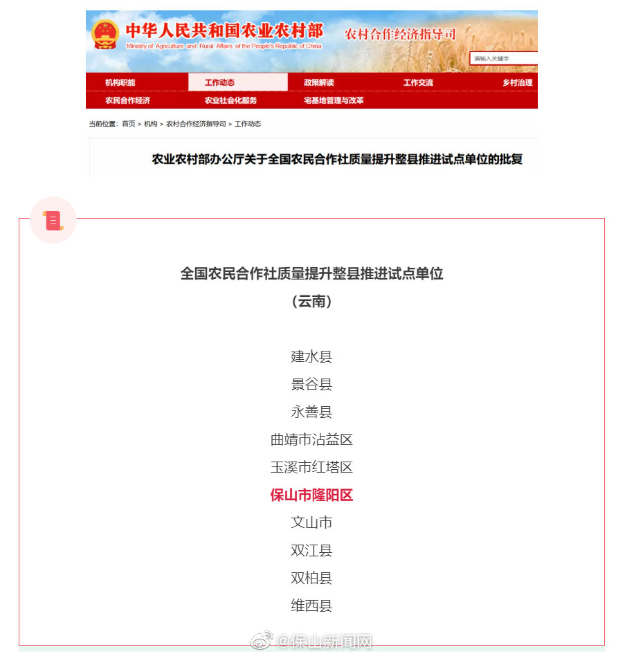 2021年,农业农村部决定继续开展农民合作社质量提升整县推进试点工作。近日,全国农民合作社质量提升整县推进试点单位已批复。其中,云南共有10地入选,隆阳区榜上有名。
