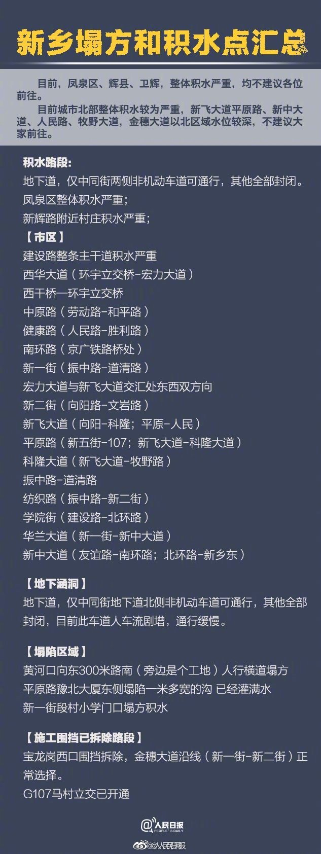 据新乡日报,目前河南新乡有这些地点积水、塌陷↓↓非必要,不外出!#河南咱们一起扛过去#@人民日报
