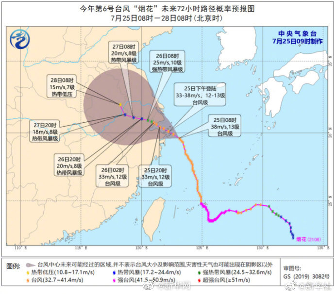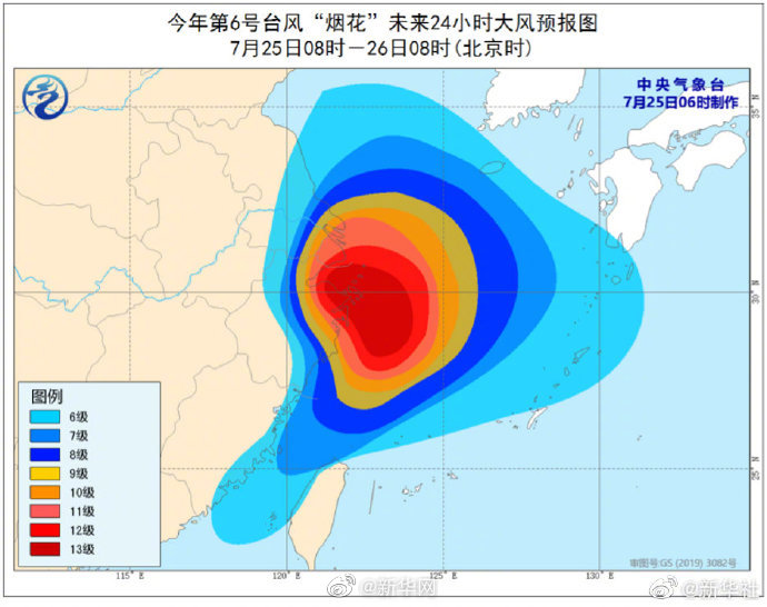 记者从中央气象台了解到,25日8时,今年第6号台风“烟花”距离浙江舟山仅95公里左右,预计其将以每小时15公里左右的速度向西北方向移动,于当天中午至傍晚在浙江象山到江苏启东一带沿海登陆(台风级,12~13级,33~38米/秒)。登陆后强度逐渐减弱,并有可能在华东地区长时间回旋或滞留。中央气象台继续发布台风橙色预警和暴雨橙色预警。