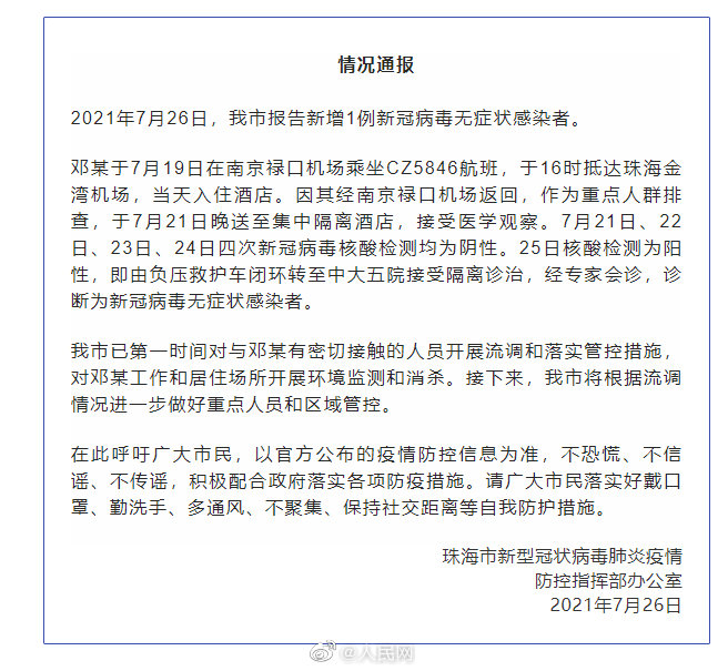 7月26日,广东珠海市报告新增1例新冠病毒无症状感染者。#新冠肺炎最新动态#