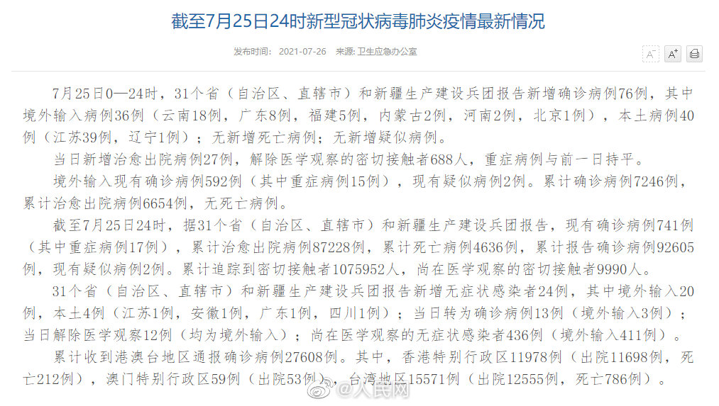 7月25日0—24时,31个省(自治区、直辖市)和新疆生产建设兵团报告新增确诊病例76例,其中境外输入病例36例(云南18例,广东8例,福建5例,内蒙古2例,河南2例,北京1例),本土病例40例(江苏39例,辽宁1例);无新增死亡病例;无新增疑似病例。#新冠肺炎最新动态#