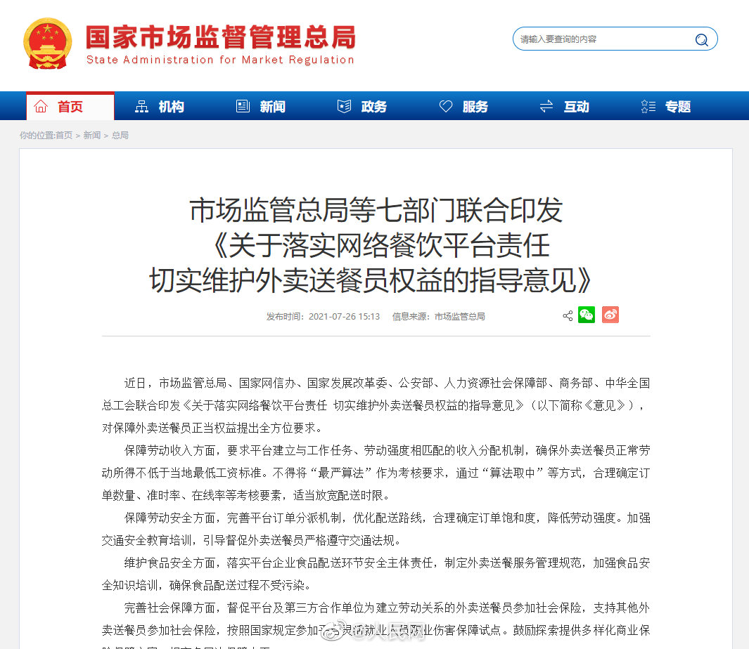 近日,市场监管总局等七部门联合印发指导意见,对保障外卖送餐员正当权益提出全方位要求。要求平台建立与工作任务、劳动强度相匹配的收入分配机制,确保外卖送餐员正常劳动所得不低于当地最低工资标准。不得将“最严算法”作为考核要求,通过“算法取中”等方式,合理确定订单数量、准时率、在线率等考核要素,适当放宽配送时限;完善平台订单分派机制,优化配送路线,合理确定订单饱和度,降低劳动强度。加强交通安全教育培训,引导督促外卖送餐员严格遵守交通法规。