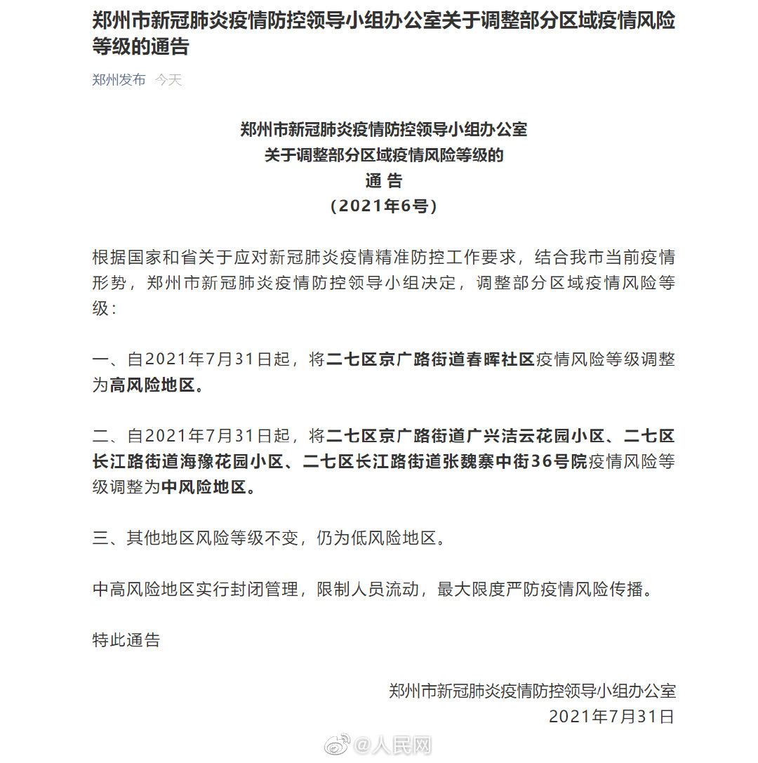 二、自2021年7月31日起,将二七区京广路街道广兴洁云花园小区、二七区长江路街道海豫花园小区、二七区长江路街道张魏寨中街36号院疫情风险等级调整为中风险地区。
