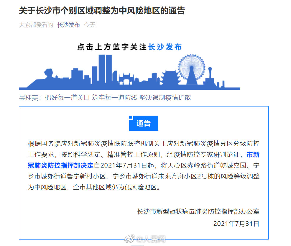 据长沙发布,湖南长沙市新冠肺炎防控指挥部决定,自2021年7月31日起,将天心区赤岭路街道乾城嘉园、宁乡市城郊街道馨宁新村小区、宁乡市城郊街道未来方舟小区2号栋的风险等级调整为中风险地区,全市其他区域仍为低风险地区。