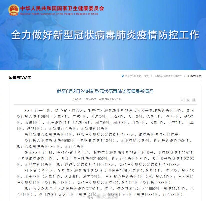 8月2日0—24时,31个省(自治区、直辖市)和新疆生产建设兵团报告新增确诊病例90例,其中境外输入病例29例(云南8例,广东6例,天津3例,上海3例,四川3例,江苏2例,陕西2例,福建1例,山东1例),本土病例61例(江苏45例,湖南6例,湖北3例,河南2例,云南2例,北京1例,上海1例,福建1例);无新增死亡病例;无新增疑似病例。