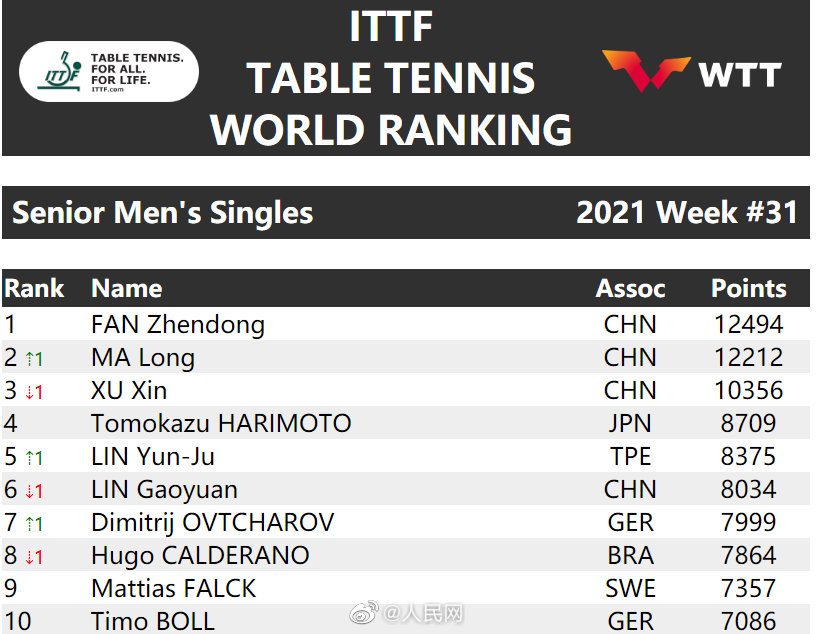 东京奥运会结束后,国际乒联公布了新一期的世界排名。男单“胖龙蟒”(樊振东、马龙、许昕)包揽前三,马龙在卫冕奥运男单冠军后升至第二。女单方面,陈梦排名稳居榜首,孙颖莎奥运会上两度击败伊藤美诚,#孙颖莎世界排名升至第二#,伊藤美诚则跌至第三,排名前十中有6位中国选手。