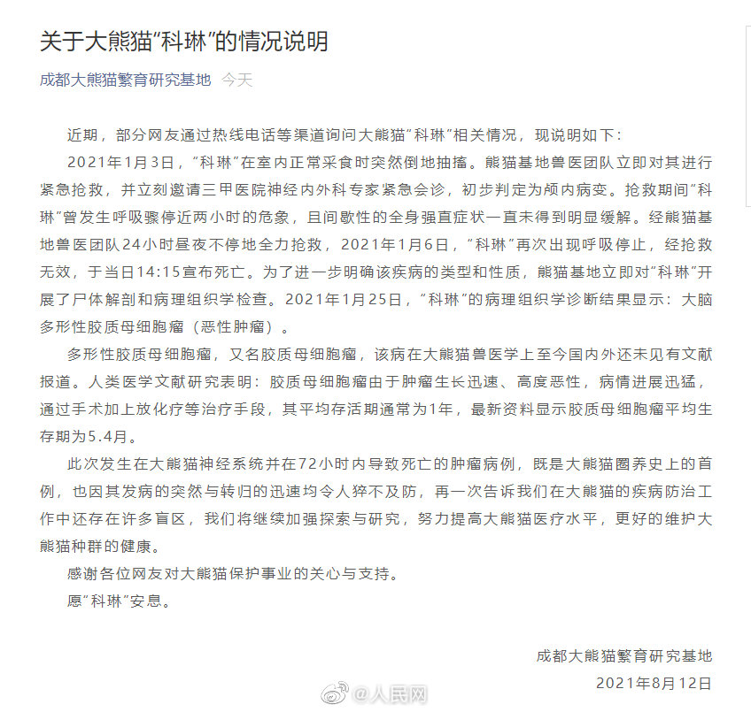 大熊猫科琳因肿瘤72小时内死亡2021年1月3日,大熊猫“科琳”在室内正常采食时突然倒地抽搐。熊猫基地兽医团队立即对其进行紧急抢救,并立刻邀请三甲医院神经内外科专家紧急会诊,初步判定为颅内病变。2021年1月6日,“科琳”再次出现呼吸停止,经抢救无效,于当日14:15宣布死亡。“科琳”的病理组织学诊断结果显示:大脑多形性胶质母细胞瘤(恶性肿瘤)。此次发生在大熊猫神经系统并在72小时内导致死亡的肿瘤病例,是大熊猫圈养史上的首例。愿“科琳”安息。(成都大熊猫繁育研究基地)