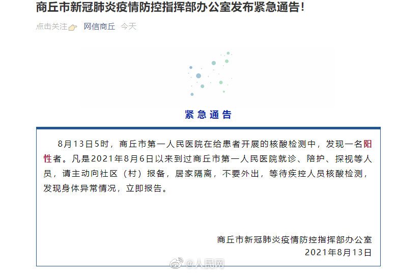 8月13日5时,商丘市第一人民医院在给患者开展的核酸检测中,发现一名阳性者。凡是2021年8月6日以来到过商丘市第一人民医院就诊、陪护、探视等人员,请主动向社区(村)报备,居家隔离,不要外出,等待疾控人员核酸检测,发现身体异常情况,立即报告。(网信商丘)