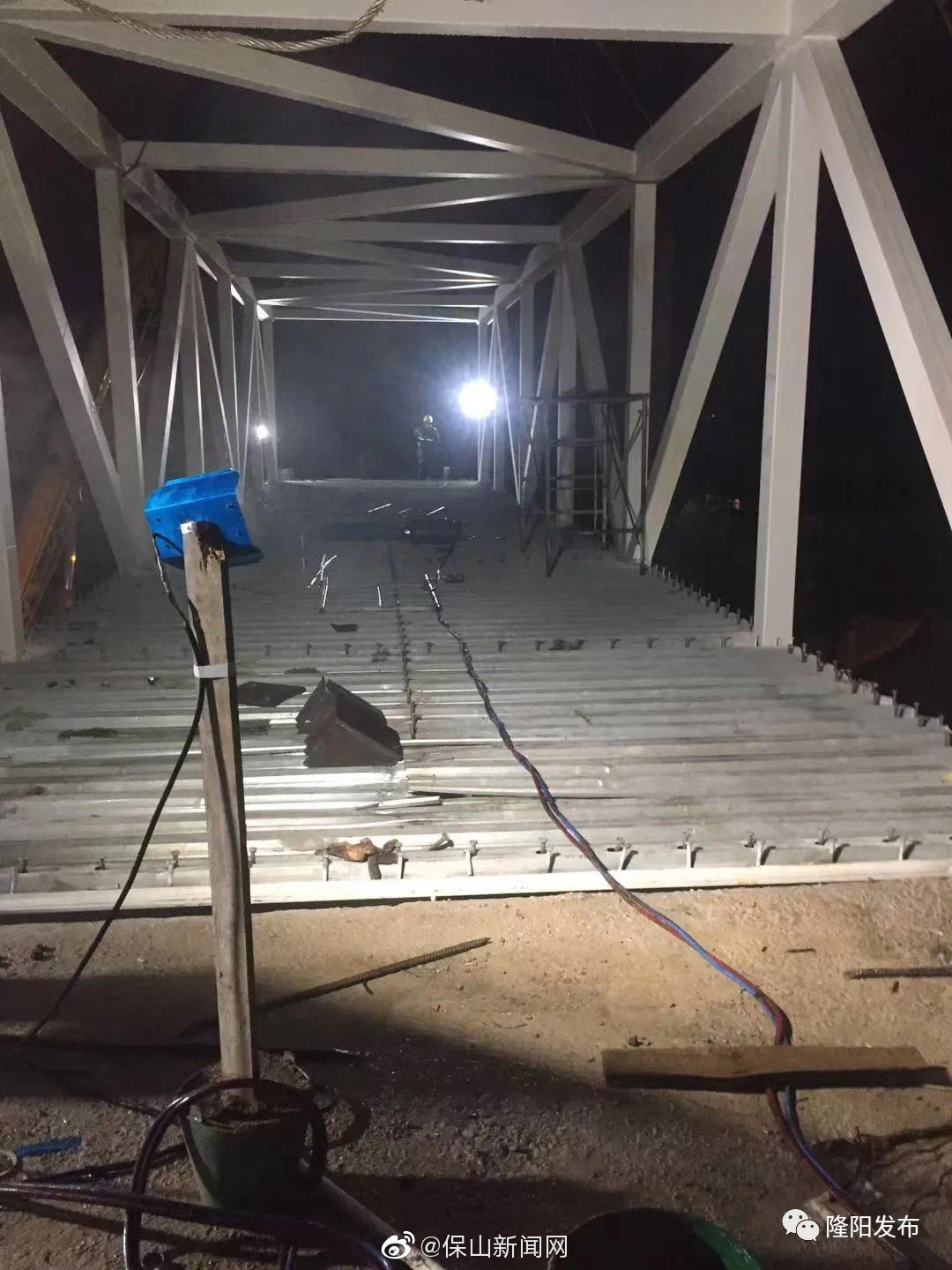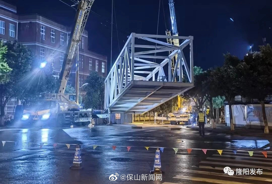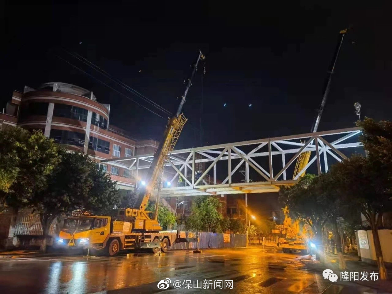 8月11日凌晨,保山市第八中学人行天桥主体钢梁吊装完成。据了解,天桥的相关配套设施将在8月11日后完善,继续进行桥面铺装、桥体装饰等附属设施等施工作业,预计在8月底全部竣工。