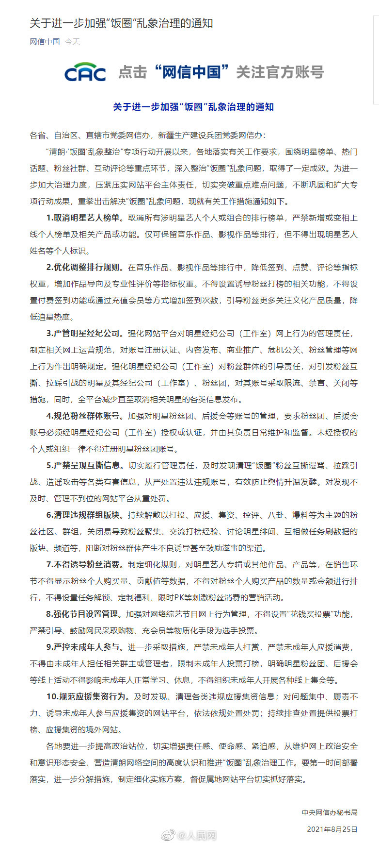 网信办要求严禁呈现互撕信息8月27日,中央网信办发布关于进一步加强“饭圈”乱象治理的通知,要求:①取消明星艺人榜单;②优化调整排行规则;③严管明星经纪公司;④规范粉丝群体账号;⑤严禁呈现互撕信息;⑥不得诱导粉丝消费;⑦严控未成年人参与……详戳↓↓(网信中国)