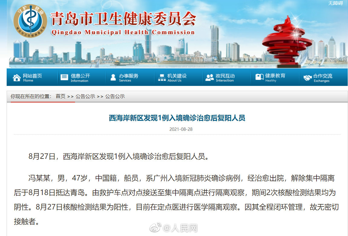 8月27日,青岛西海岸新区发现1例入境确诊治愈后复阳人员。