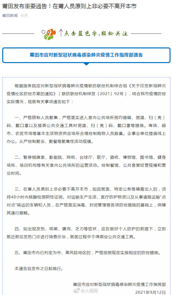 新冠肺炎最新动态据福建莆田市应对疫情工作指挥部通告,自9月12日起,在莆人员原则上非必要不离开本市,如因就医、特定公务等确需出入的,须持48小时内核酸检测阴性证明。详戳→(莆田新闻)