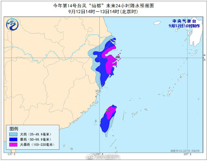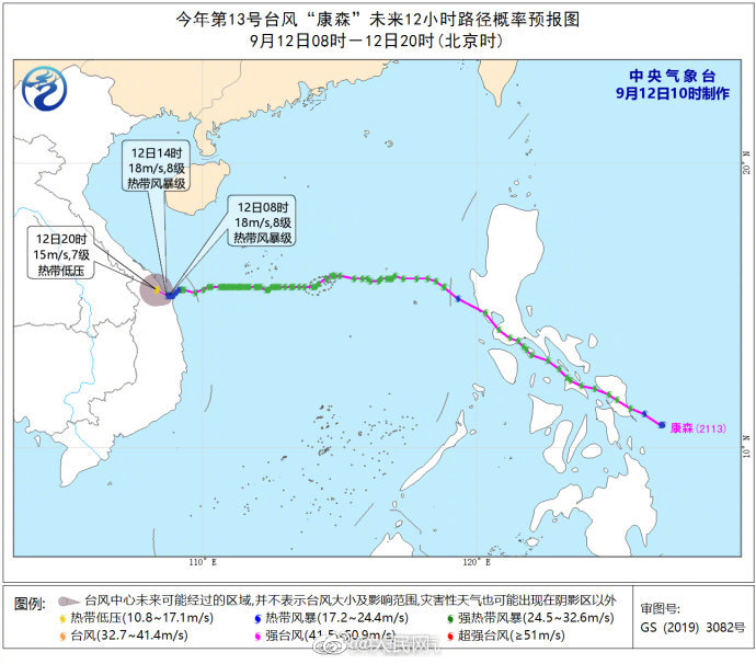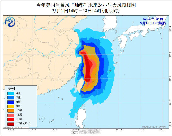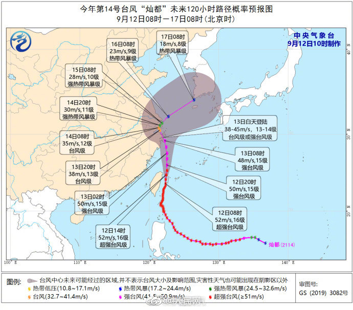 据@中国天气 消息,中央气象台9月12日10时继续发布台风橙色预警:预计,台风“灿都”将以每小时20-25公里左右的速度向偏北方向移动,今天下午将进入东海南部,于13日白天在浙江舟山到三门一带沿海登陆,或擦过舟山近海进入杭州湾,14-15日在杭州湾附近海面或地区回旋少动,16日开始转向东北方向移动,强度逐渐减弱。