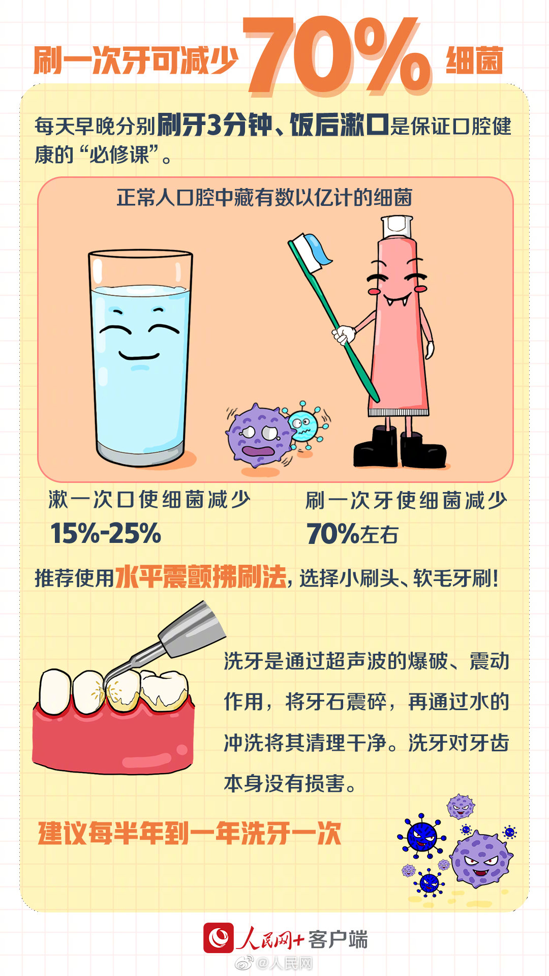 正常人口腔中藏有数以亿计的细菌,#刷一次牙能使减少70%细菌#。早晚刷牙、饭后漱口、定期洗牙……这些好习惯可让你远离牙病。今天是第33个全国爱牙日,一起解锁牙齿的健康密码吧!(人民网+)