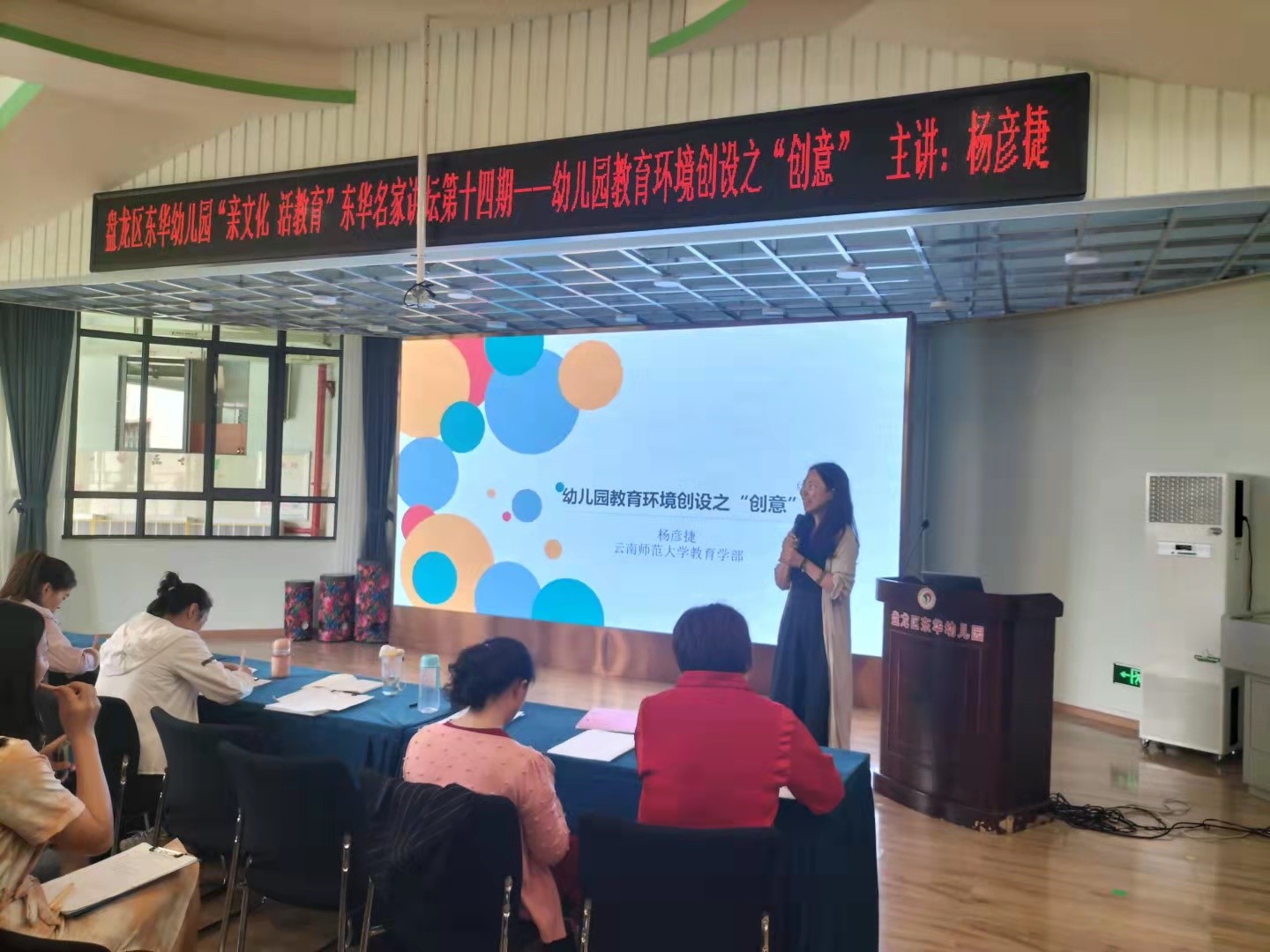 据介绍,学期初,园方邀请了来自云南师范大学杨彦捷副教授到园开展题为《幼儿园教育环境创设之“创意”》的专题讲座。从:何为“创意”?创意从何而来?墙面的创意展示三个方面进行讲解,结合大量国内外的环境创设图片欣赏,从“儿童的视角”去解读环境的创设和创意,开阔了教师们的视野,拓宽了儿童立场的环境创设思路。