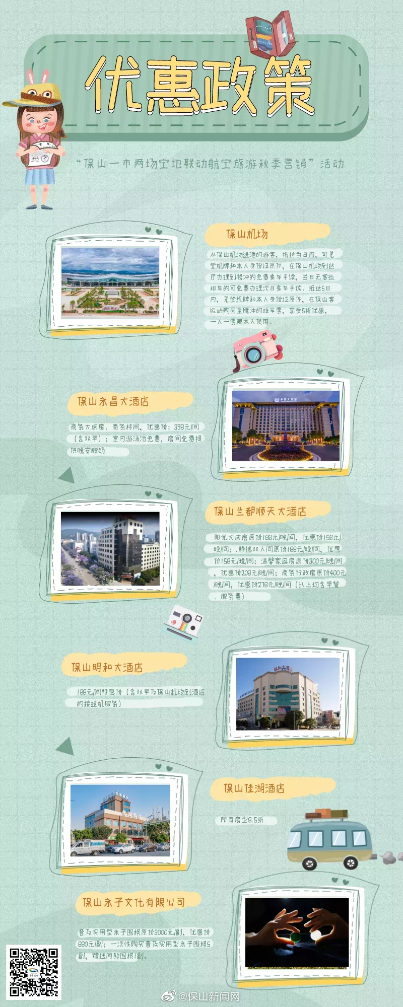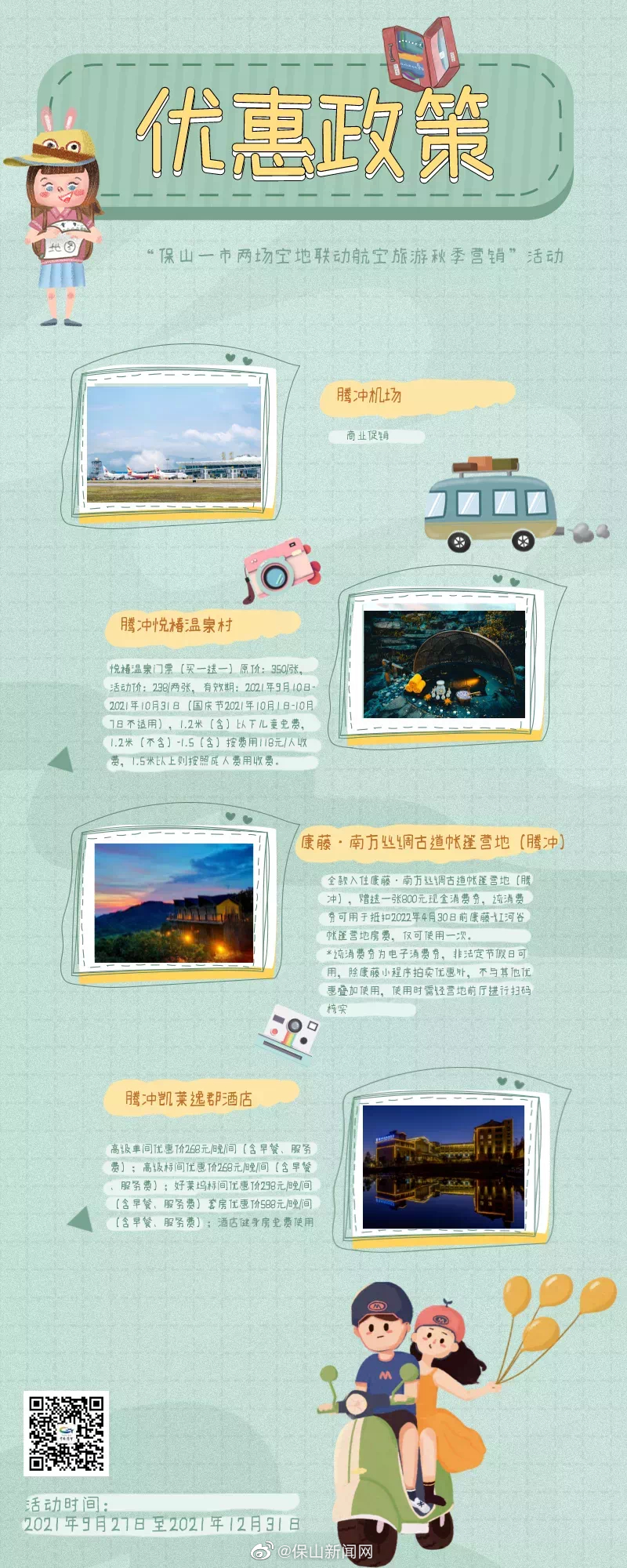 自2021年9月27日至2021年12月31日,凡是乘坐保山机场或腾冲机场进港的旅客,凭3天内乘机证明及身份证到相关景区、酒店游玩住宿,即可享受各企业提供的住宿、娱乐、观光、交通等优惠政策。