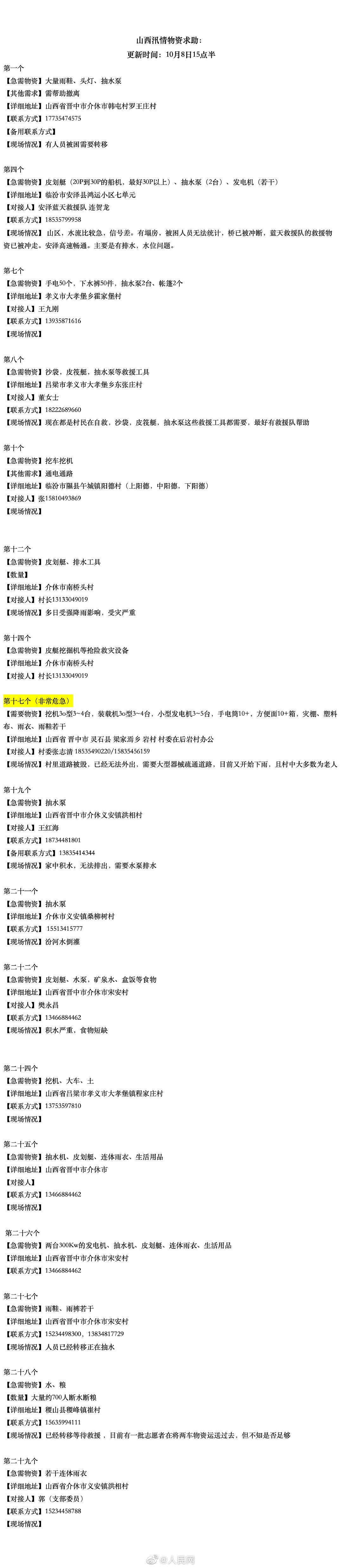 国庆期间,山西多地遭遇连日强降雨。根据山西防灾服务台志愿者核实,山西急需救援物资如下↓↓#一起关注山西暴雨#,山西加油!(人民网)