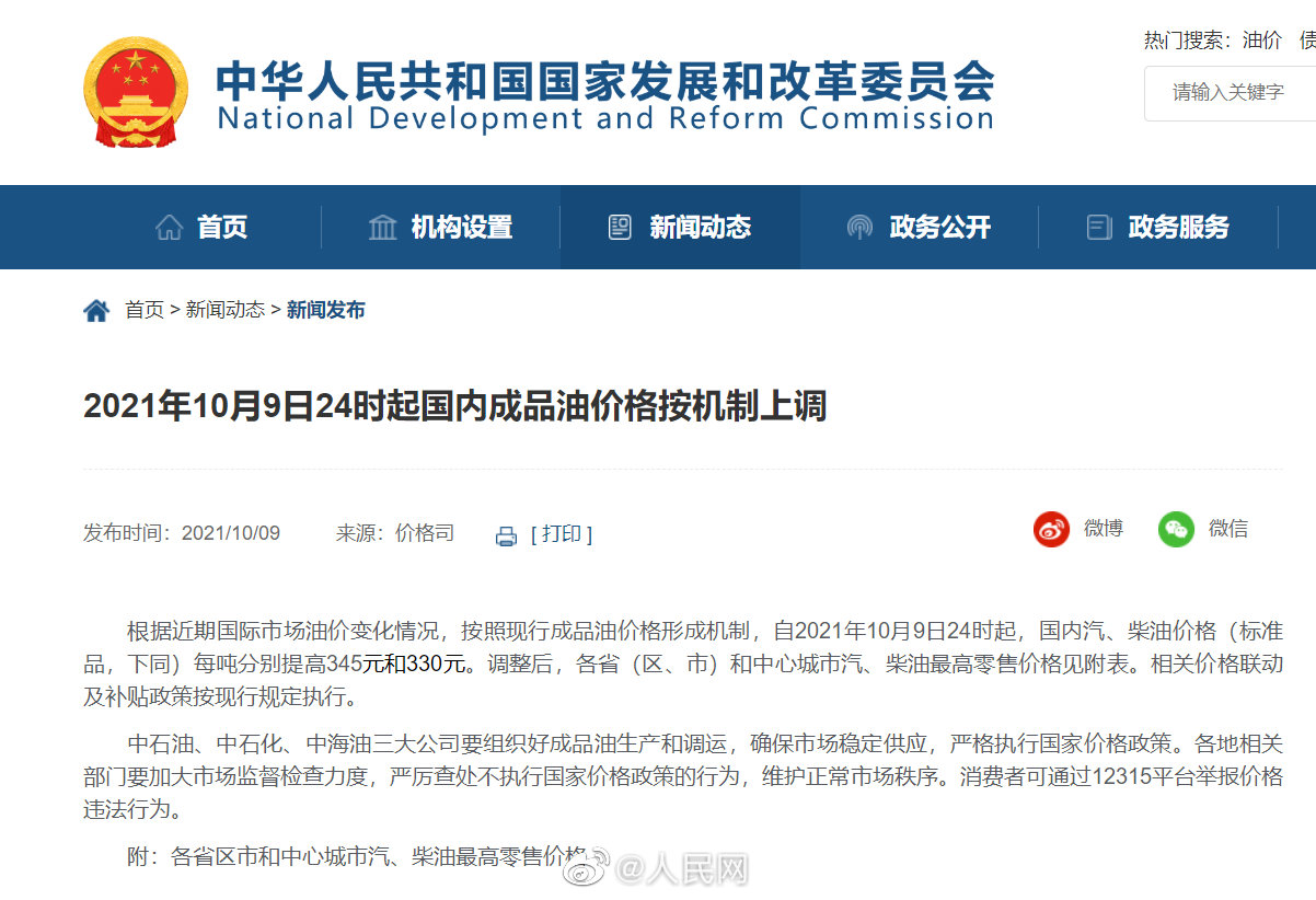 国内柴油价格每吨提高330元自2021年10月9日24时起,国内汽、柴油价格(标准品,下同)每吨分别提高345元和330元。调整后,各省(区、市)和中心城市汽、柴油最高零售价格见附表。相关价格联动及补贴政策按现行规定执行。(国家发改委)